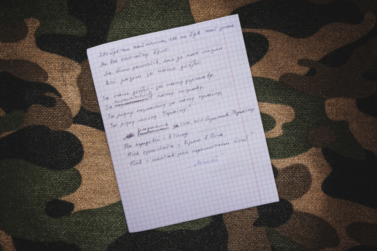 Вірші він пише давно. В них – емоції від побаченого, пережитого. Зараз рядки складати доводиться між бойовими діями, записує їх ручкою, на аркуші учнівського паперу. З початку війни віршів вже назбиралося багато, але зошит з ними, на жаль, згорів. Втім, Лєший каже, що не сумує над цим. «Все можна відновити, головне зараз визволити нашу країну, – каже він. – А потім буде і творчість і звичайна робота – налагоджувати та відбудовувати зруйноване. Слава Україні!»