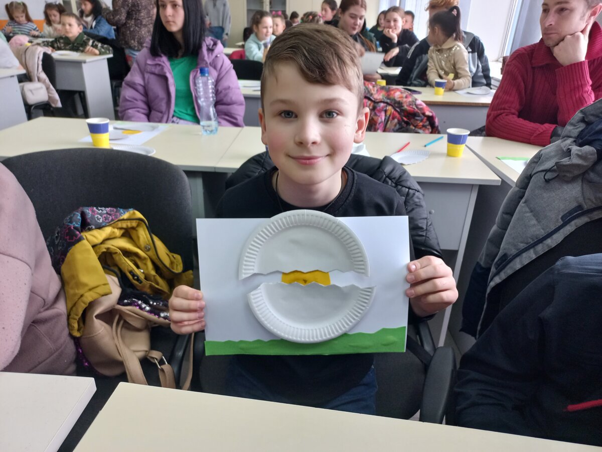 Поряд с Данилом двох непосидючих хлопчиків намагається усадити за стіл Людмила Литовченко. Малим дуже хочеться все роздивитися, усюди зазирнути, адже така подія – святковий майстер-клас – відбувається в їхньому житті вперше. Людмила привезла свого старшого сина Максима та його товариша Кирила, обом по 6 років. Родина приїхала із селища Червоний маяк, що на Херсонщині. Поки хлопці з цікавістю роздивлялися елементи поробки, які їм дали волонтери, Людмила поділилася своїми сподіваннями щодо свята Великодня та взагалі щодо особистих планів на майбутнє.
