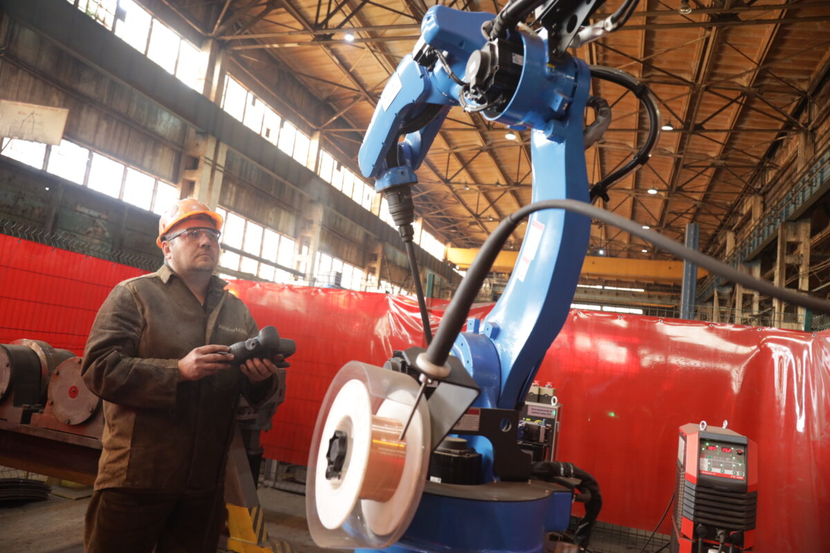 В електрозварника Олександра Тинка досвід у зварювальній справі великий – 22 роки. За цей час йому довелося виконувати різні найскладніші завдання та працювати з різними напарниками. А нещодавно таким напарником Олександру став… зварювальний робот-маніпулятор. Тинок, посміхаючись, називає його «третьою рукою», настільки органічно «помічник» слухається зварника і допомагає йому у роботі. А ще робот у прямому сенсі береже здоров’я працівника.