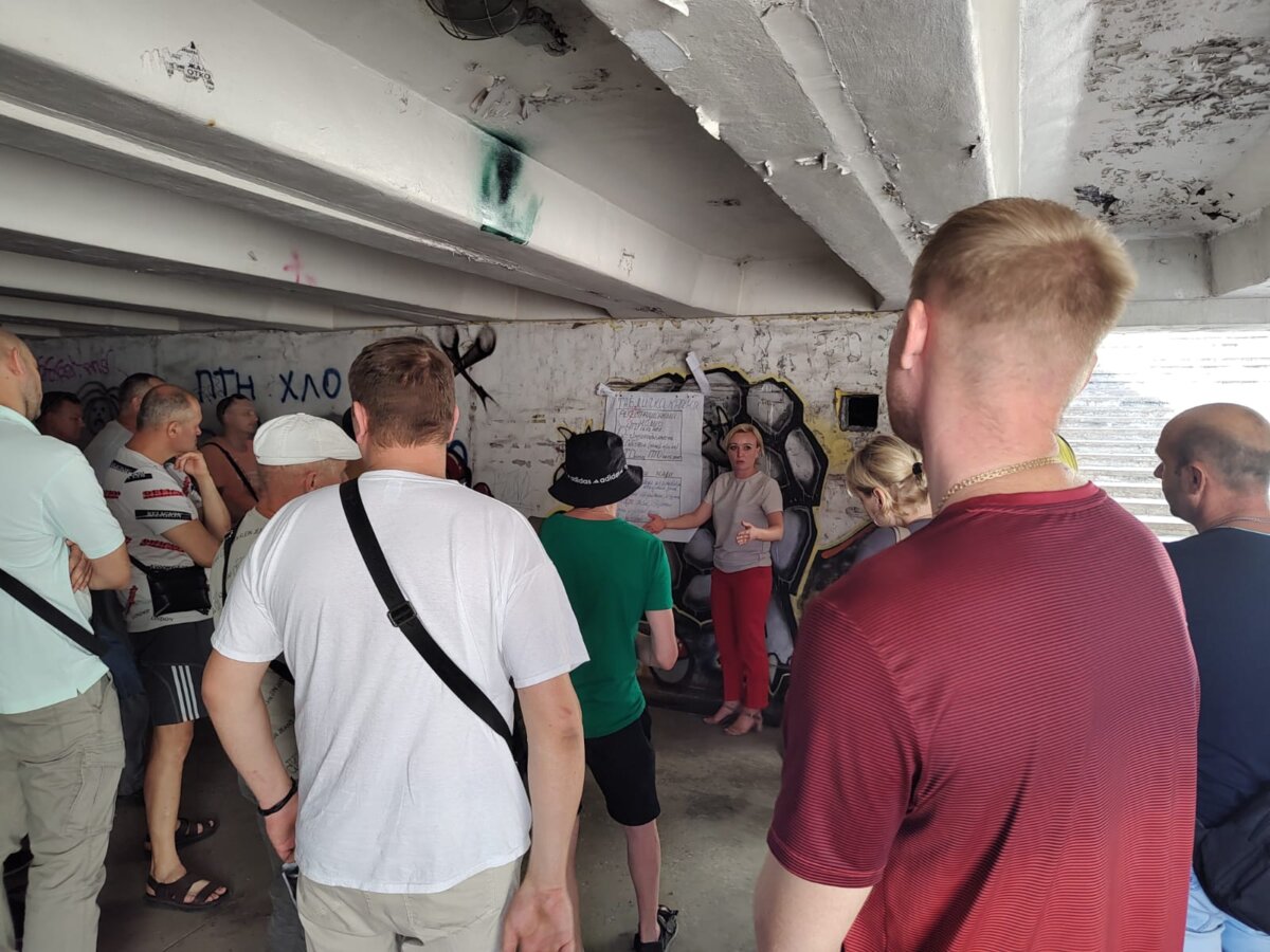 Вибух і знову сирена. Люди на зупинці «Третя дільниця» спустилися до підземного переходу. Серед значної кількості народу особливо виділялася група до 30 людей, які зібралися разом і щось уважно слухали, зосереджено дивилися на якийсь плакат, жваво спілкувалися. Перехожі підходили, цікавилися і розуміли, що тут, посеред підземного переходу тривають заняття.