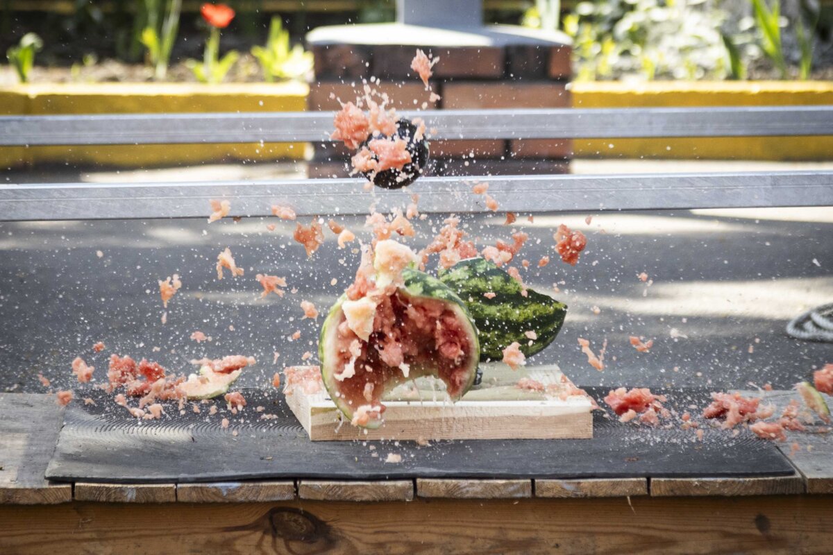 Другий машиніст конвеєра з дозволу оператора вмикає конвеєр. Режим швидкісної зйомки моєї фотокамери дозволив зняти всього три кадри, перш ніж машиніст-манекен повністю зник під барабаном. Його розчавлює потужна техніка. Залишаються стирчати лише робочі черевики. Тобто якби то була жива людина, у неї б не було жодного шансу.