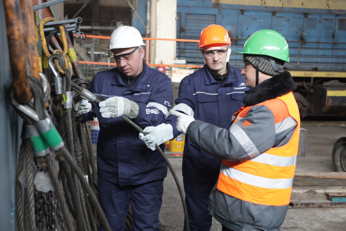 Сьогодні провідний інженер проводить міні-тренінг зі слюсарями з ремонту рухомого складу. Вони ремонтують тепловози, які мають масивні деталі та вузли. Наприклад, двигун тепловозу «Д-50» важить до 24 тонн. Слюсарям доводиться знімати це й інше масивне залізяччя з локомотивів, транспортувати до ремонтних зон, а після ремонту – встановлювати на місця. Тож операції з вантажопідйомними механізмами для них – щоденна робота. Тема сьогоднішнього заняття – процедура огляду та відбракування знімних вантажозахоплювальних пристроїв, тобто стропів, які використовуються під час переміщення вантажів кранами.