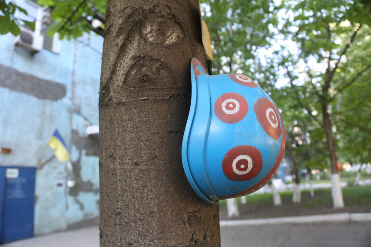 Люди доводять територію до ладу творчо, креативно. Наприклад, зі старої тракторної шини, яка незрозуміло як сюди закотилася, зробили яскравий горщик і посадили квіти. А старі каски розфарбували під яскравих жуків-сонечок і розвісили на стовбурах дерев. Бо гарний настрій – це запорука плідної роботи.